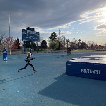 Youth track offers a subset of traditional track & field events. The throwing events use lighter implements for safety and emphasis on technique. The running events are grouped by age. Everyone loves the long jump--sand!